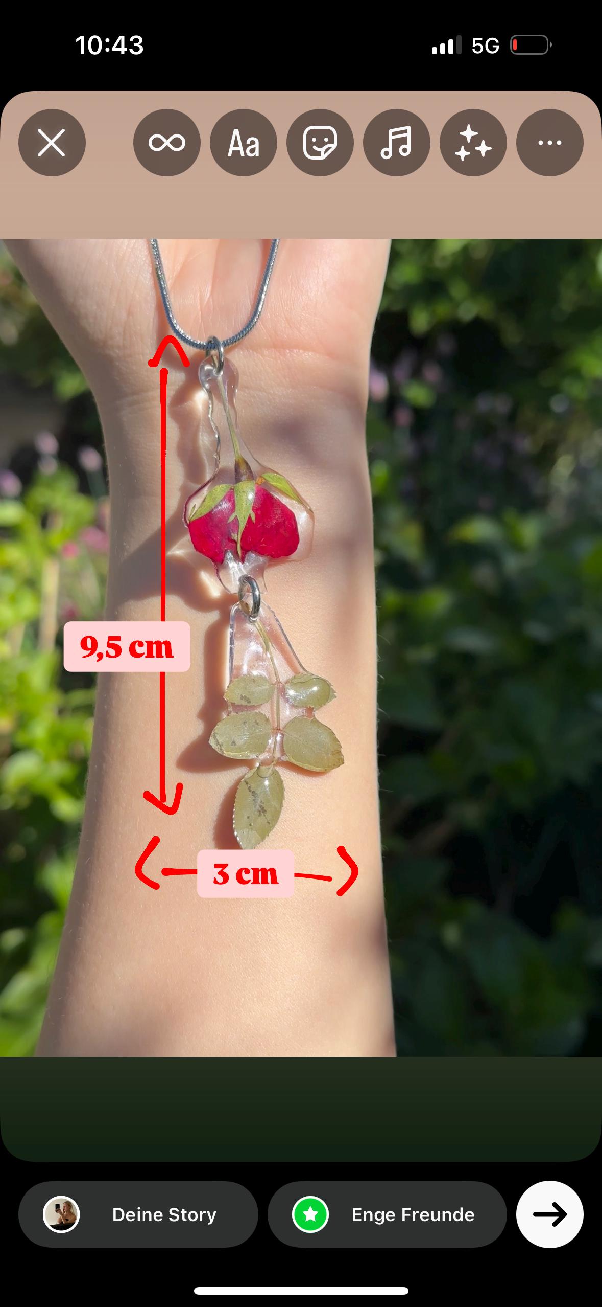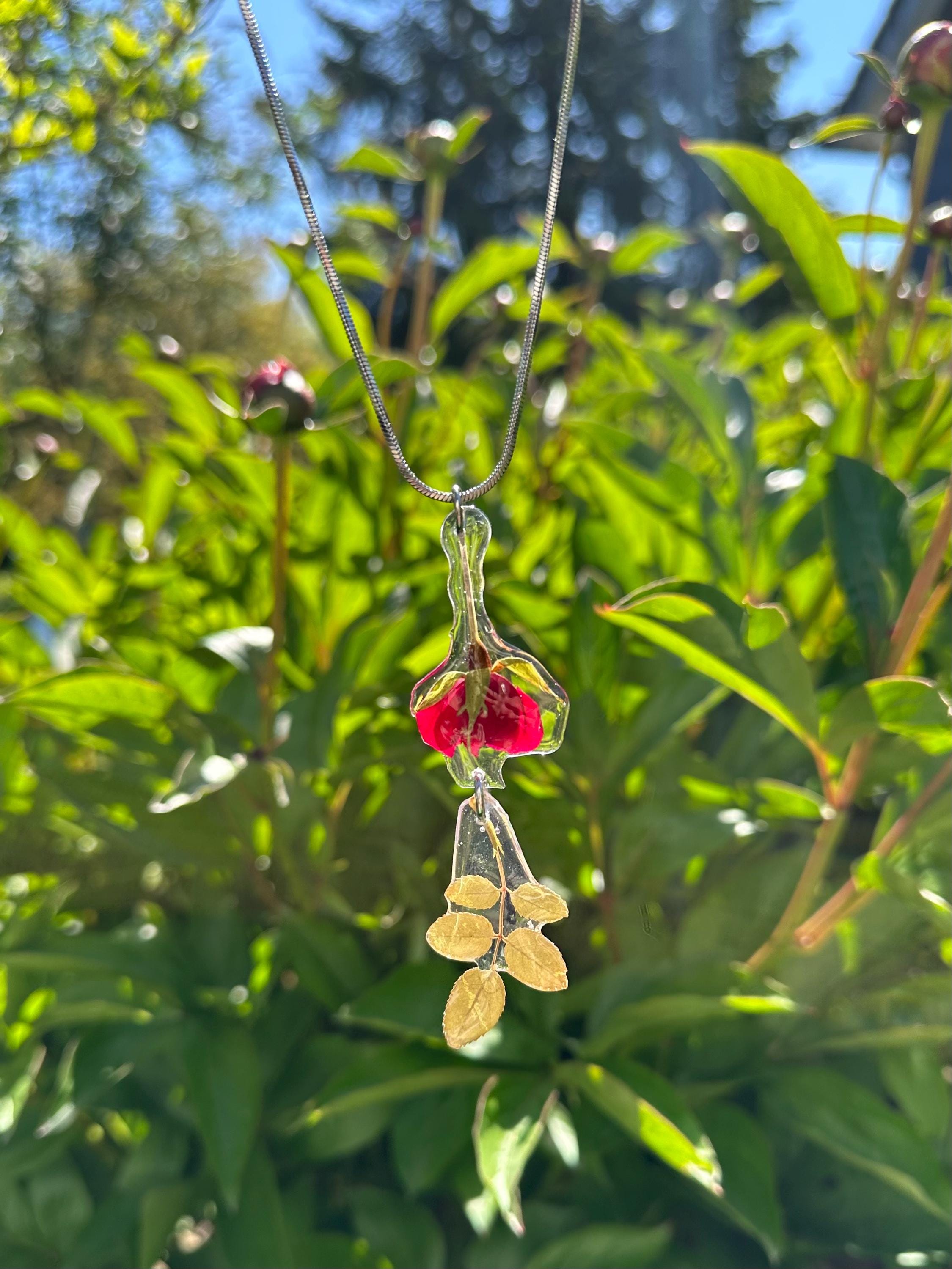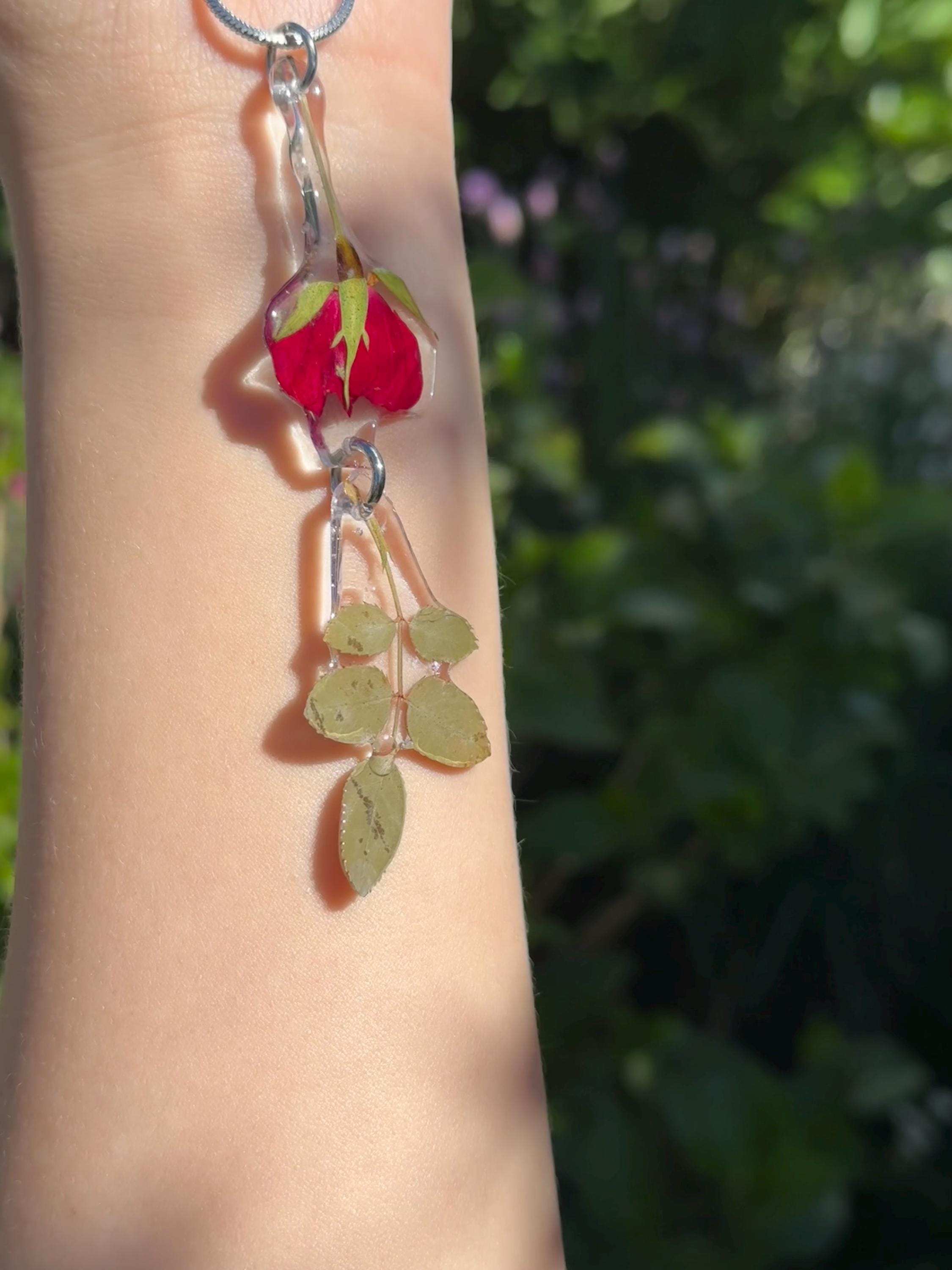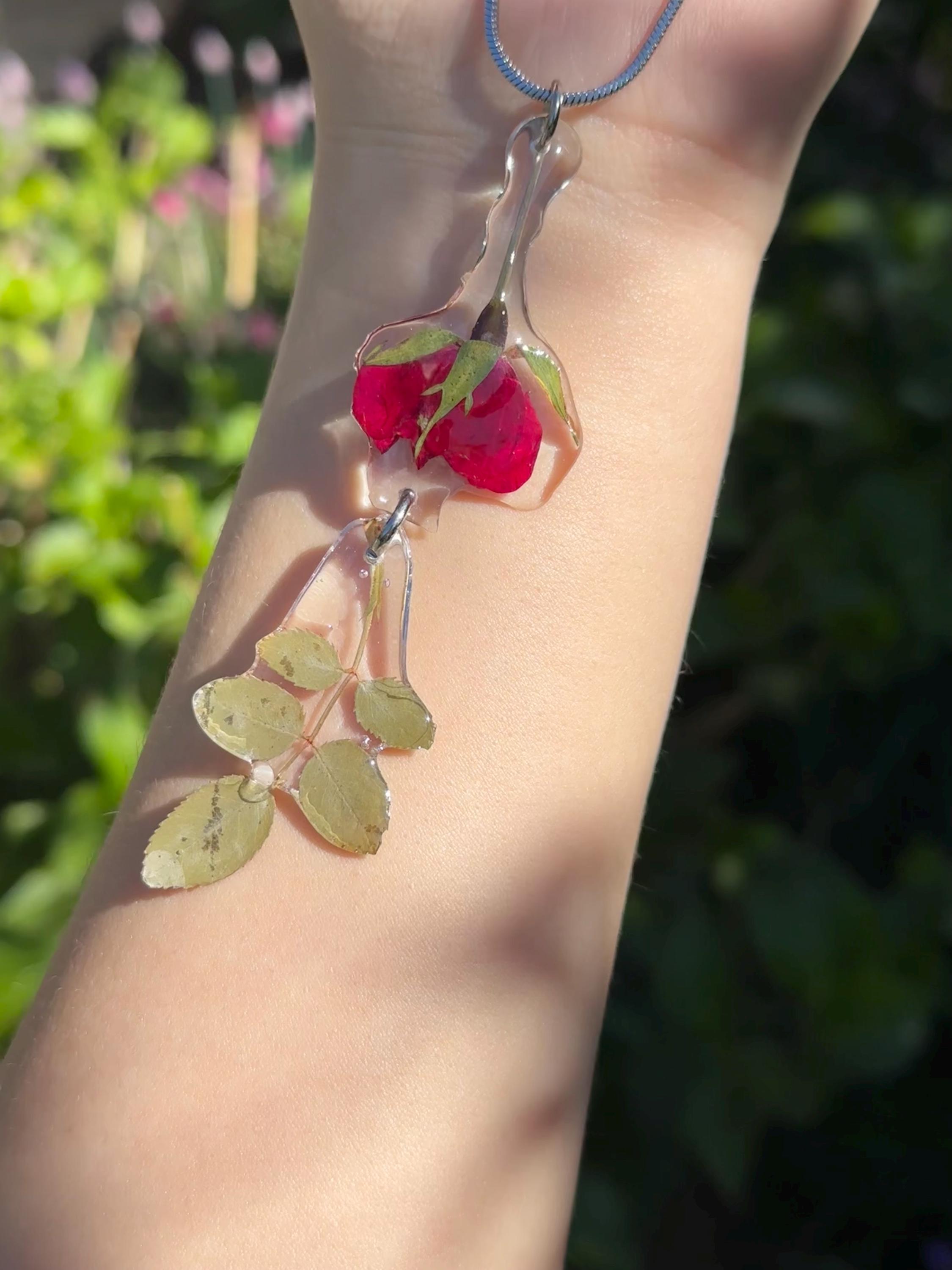 This beautiful necklace pendant consists of a real red rose encased in two layers of UV resin. The flower looks intentionally delicate, yet is very sturdy. Its petals are attached to the rose.